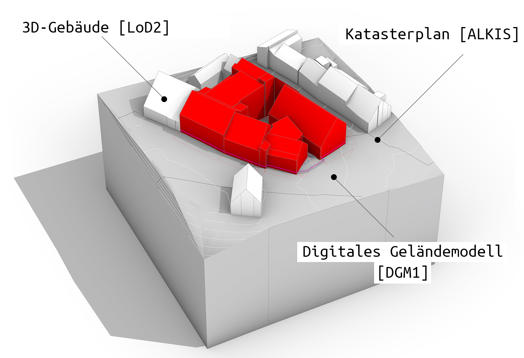 Im ersten Schritt rufen wir drei amtliche Datensätze aus öffentlichen Schnittstellen ab. Durch diese drei Datensätze können wir Ihr Grundstück und die Umgebung 3D und sehr präzise abbilden. Dabei handelt es sich um die innovativste und umfangreichste Planungsgrundlage überhaupt.