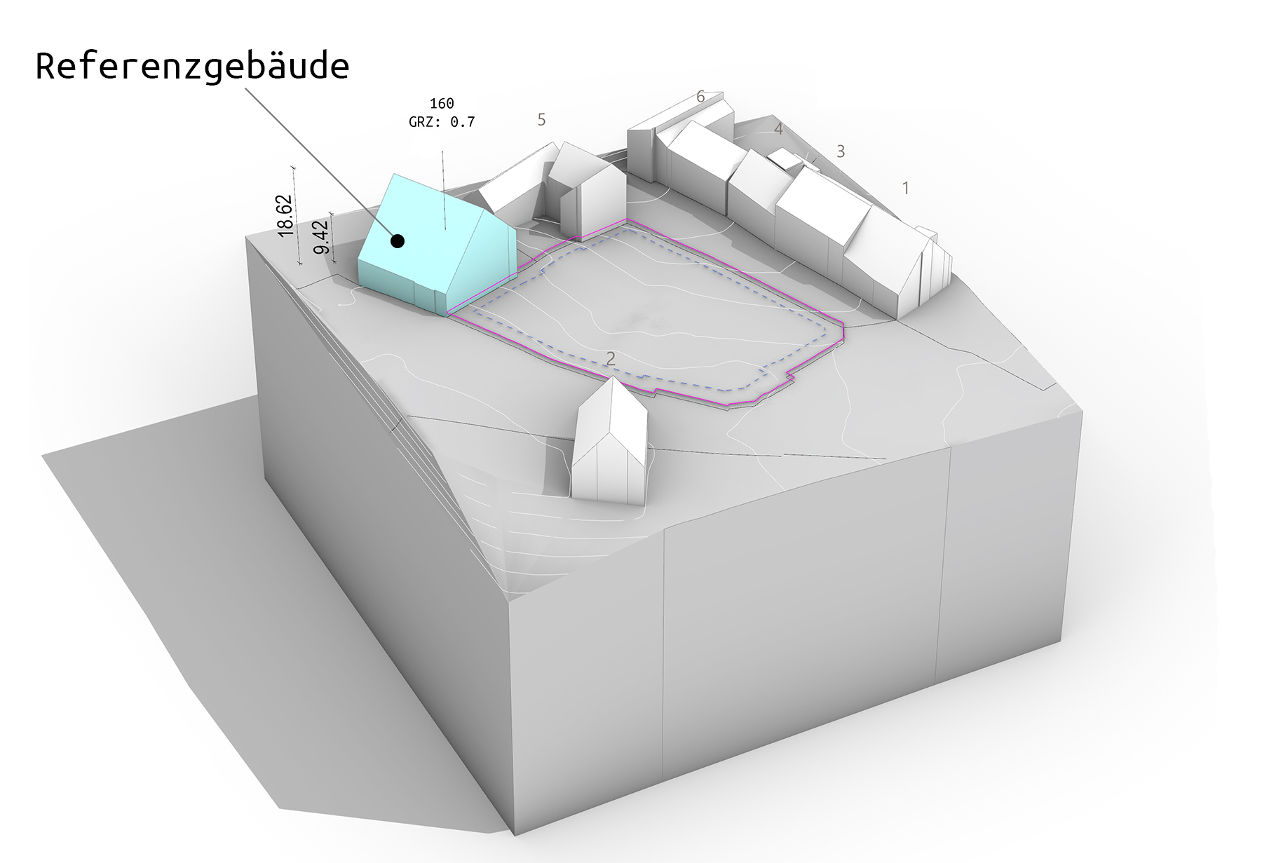 Nach §34 BauGB ist ein Gebäude baurechtlich zulässig, wenn es sich in die Eigenart der näheren Umgebung einfügt. Um die Eigenart der Umgebung festzustellen analysieren wir im zweiten Schritt die Geodaten nach Volumen, Grundfläche sowie Trauf- und Firsthöhen. Durch diese Werte kann ein "Referenzgebäude" definiert werden, wodurch sämtliche Bebauungsparameter abgeleitet werden können: