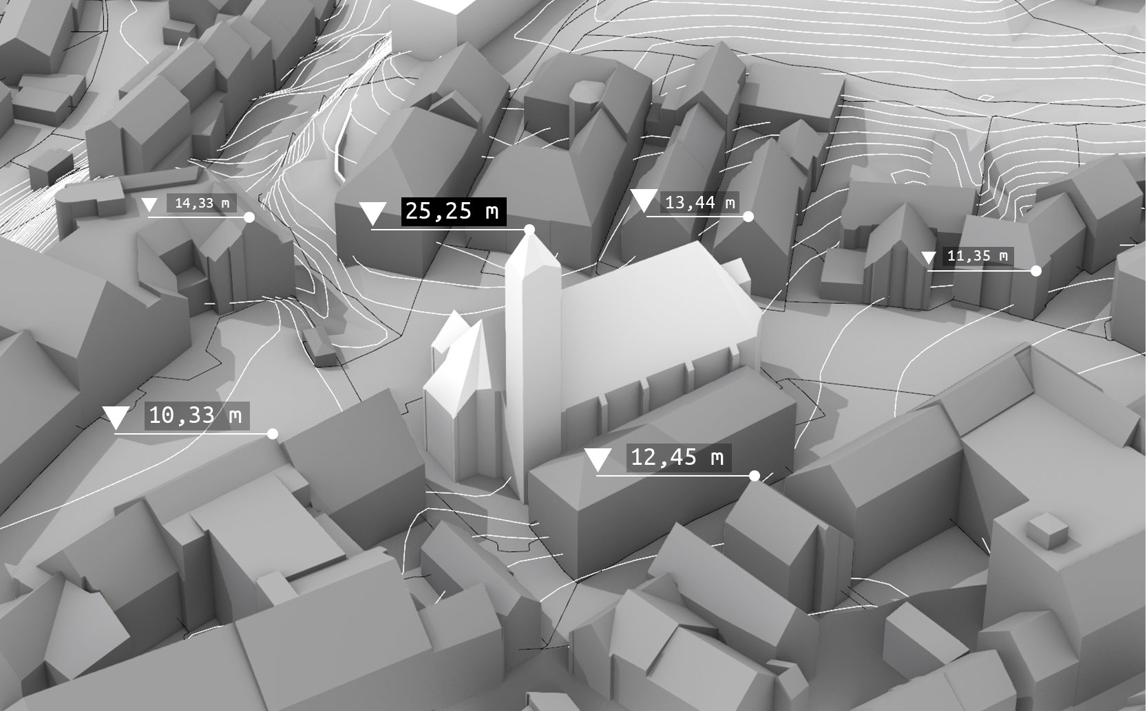 Bei der herkömmlichen Gebäudeplanung (nur) auf Grundlage von 2D-Lageplänen bleibt die dritte Dimension oft unberücksichtigt: Trauf- First- und Geländehöhen der Nachbargebäude sowie der Bestandsgebäuden müssen oft aufwendig vor Ort vermessen oder mühselig aus Bestandsplänen ausgelesen werden. Mit unserem "Geodaten"-Produkt liefern wir derzeit die präziseste Datengrundlage. Andere Datensätze (z.B. OpenStreeMaps) zeigen keine komplexen Dachformen wie Walm- Sattel- oder Pultdächer.